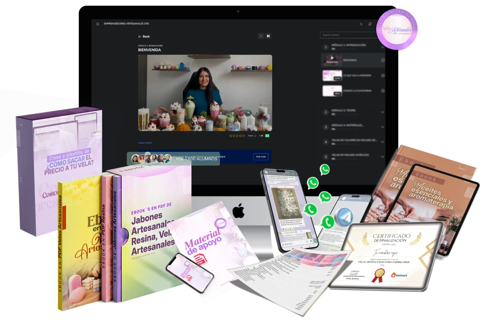 Más de 150 clases en video y más de 15 horas de contenido práctico, donde aprenderás desde cero a crear, diseñar y vender tus propias velas como una experta.